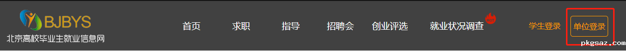 1.用人单位参会报名,请登陆北京高校毕业生就业信息网(www.bjbys.net.cn)首页,点选右上角“单位登陆”按钮。