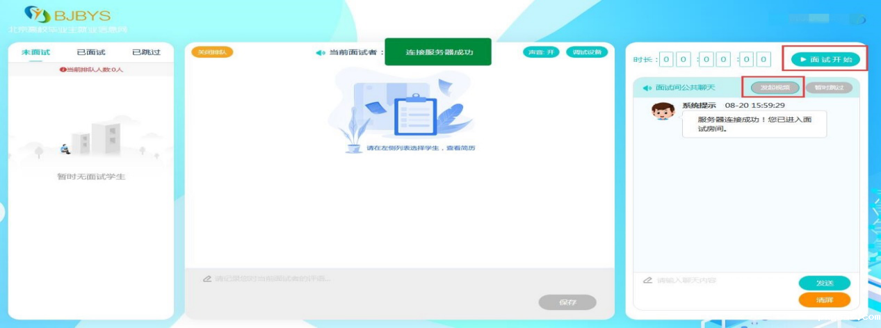 2.进入面试间后,点击右上角“开始面试”按钮,即显示面试官进入面试间提示。点击发起视频即可开始与预约排队毕业生进行面试。