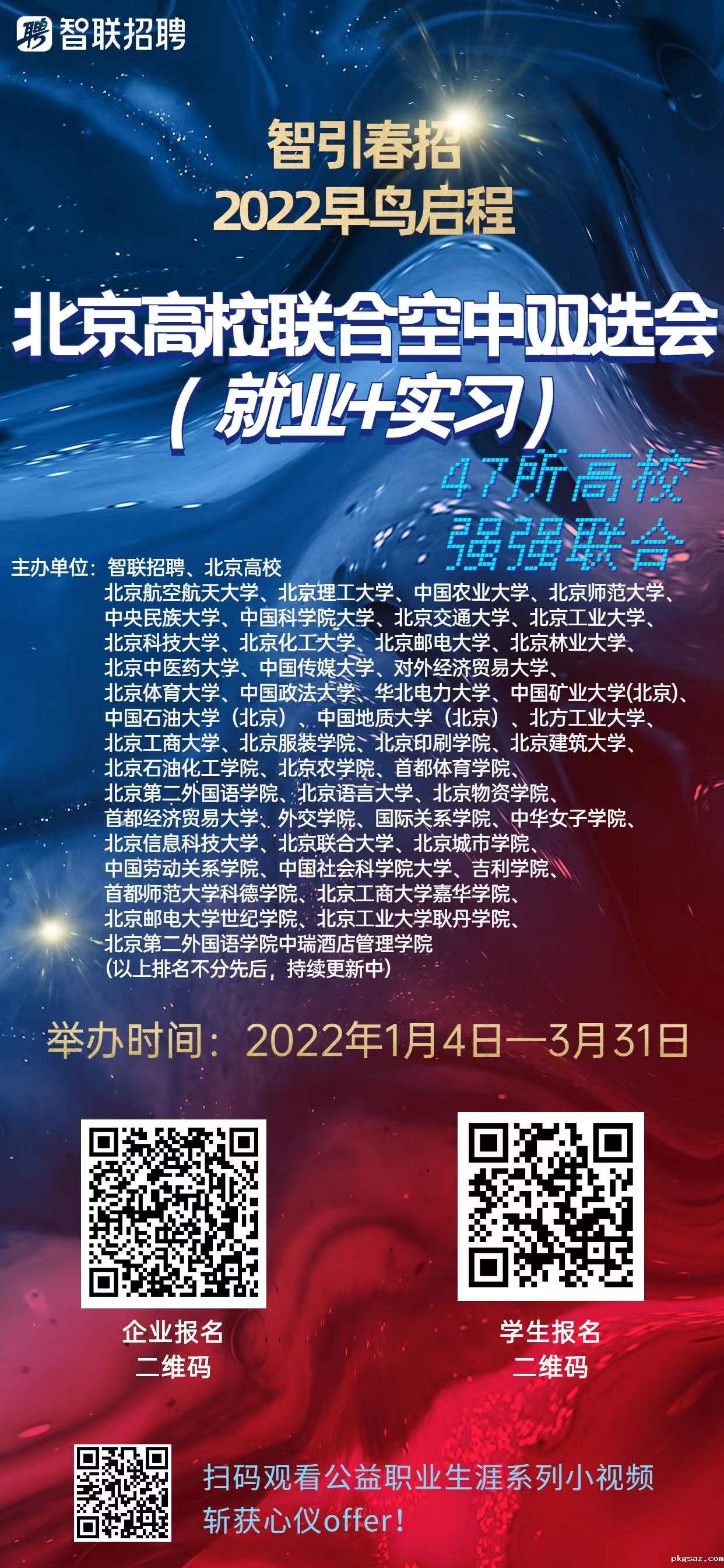 为全面贯彻落实教育部、北京市关于疫情防控工作的有关要求,更好地为用人单位和高校提供安全、便捷、高效地信息沟通和双向选择平台,抓住当前毕业生求职的关键期、冲刺期,全力促进高校毕业生顺利毕业、尽早就业。智联招聘联合北京高校于2022年1月4日至3月31日举办“‘智引秋招,2022早鸟启程’北京高校联合空中双选会(就业+实习)”活动。 活动期间大量覆盖客户,积极与必威betway西汉姆联网站进行互动,促进并解决用人单位和必威betway西汉姆联网站的双向需求。